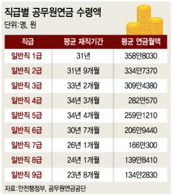 • 월평균 수령액 (2022년 기준): 공무원연금 268만 원, 국민연금 58만 원
