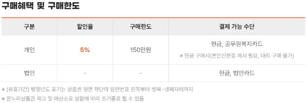 전통시장과 지역 상점가의 활성화를 위해 정부에서 발행하는 상품권으로, 그 목적상 사용처가 시장과 지역상점으로 제한되어 있다. 따라서 전국에서 운영을 하는 대형마트나 프랜차이즈에서는 사용이 제한된다. 정확한 사용처는 소상공인통통 온누리상품권 가맹점포 찾기를 이용하거나 상점 외부에 붙어있는 가맹점 스티커를 확인하면 된다. 소비활성화를 위하여 구매 시 상품권 가격의 5%에서 10% 정도를 할인해서 판매하기 때문에 지역 시장에서 비싼 물건을 구매해야 할 때는 온누리 상품권을 먼저 구입 후 지불하면 돈을 절약할 수 있다. 개인 구매한도는 월간 100만 원이다.