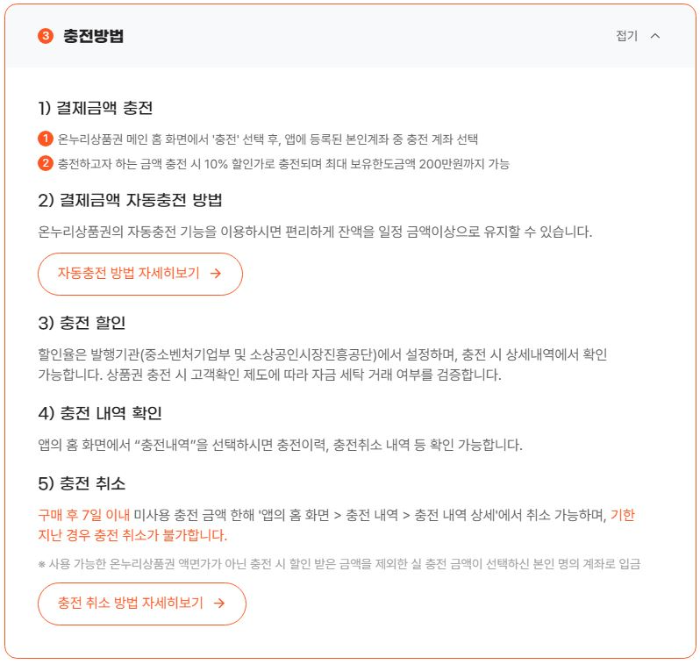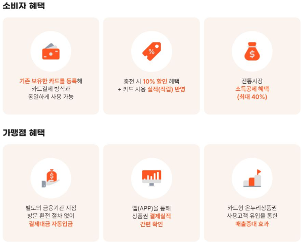 결제하고자 하는 금액이 충전 잔액보다 큰 경우에는 전체가 일반 신용카드 결제로 전환되기 때문에 취소선 내용처럼 자투리 금액까지 소진되지는 않는다. 모바일상품권과 비교하자면, 앱에서 상품권을 충전하는 방식은 동일하나, QR결제가 아니라 소비자에게 익숙한 카드결제 방식이 장점이다. 모바일상품권을 쓰려면 17개나 되는 판매대행 앱에서 하나를 선택해야 하지만, 카드형 상품권은 소상공인진흥공단이 앱을 직접 제공하므로 소비자 혼선이 없다는 것도 있다. 단, 카드형 온누리상품권은 다른 방식의 상품권과 달리 결제 과정에서 결제 수수료가 발생하여 아직 현금이나 지류 상품권을 카드 결제보다 우선시하는 시장 상인들에게 단점이 될 수 있다. 그럼에도 이 상품권을 내놓은 중소벤처기업부의 의도는, 카드 결제 수수료가 발생하더라도 고객에게 메리트를 더 주어 전통시장에 방문하는 고객을 더 유치하자는 것. 온누리상품권의 할인 혜택은 유지하면서 결제 편의성을 높여 전통시장을 찾는 인원수 자체를 늘리자는 것이 목적인 셈.