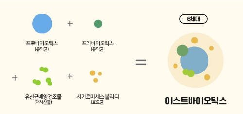 6세대: 이스트바이오틱스 = 유산균+먹이 +유산균대사산물+효모균