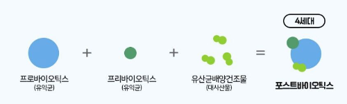 4세대: 포스트바이오틱스 = 유산균+먹이+유산균대사산물