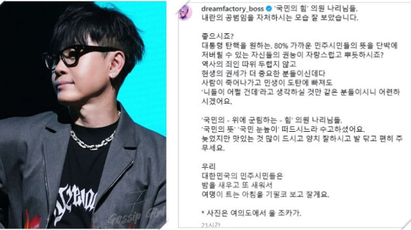 이승환: 가수로서 탄핵 촉구 시위에 응원의 목소리를 냈습니다.