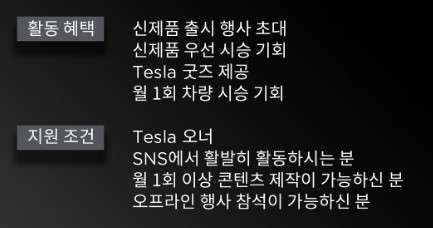 테슬라가 주최하는 이벤트나 프로모션에 참여하여 브랜드의 활동을 지원하고, 고객과의 직접적인 소통을 통해 브랜드 충성도를 높입니다.