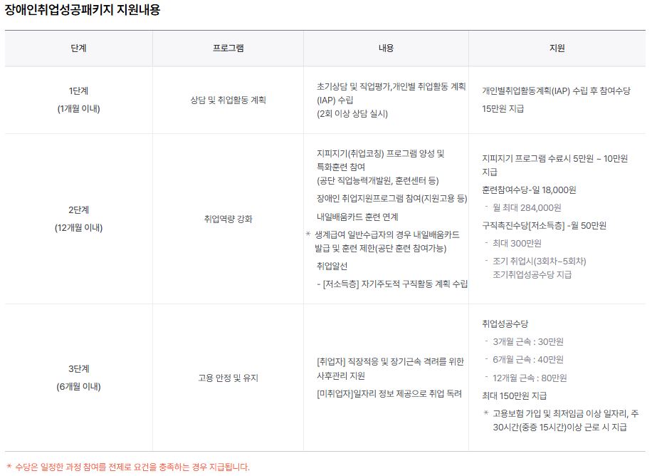장애인취업성공패키지에 참여하며 취업에 성공한 경우 취업일로부터 종료가 됩니다. 취업에 성공한 경우 주 30시간 이상(중증 장애인: 주 15시간) 근무하고, 고용보험 가입 가능한, 최저임금 이상 일자리에 취업한 사람이, 취업 후 3개월간 계속 근무하면 30만원, 6개월간 계속 근무하면 40만원, 12개월간 계속 근무하면 80만원을 지급하여 최대 150만원을 지급받을 수 있습니다. 또한 3개월의 사후관리 서비스도 받을 수 있습니다.