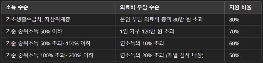 -의료비 부담 기준: 소득 구간별 본인 부담 의료비 총액이 기준 금액을 초과할 경우 지원됩니다.