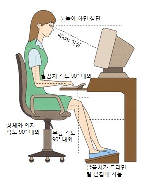 화면과의 눈의 거리는 50cm 이상, 모니터는 눈보다 10~20도 아래 배치하는 것이 좋습니다.