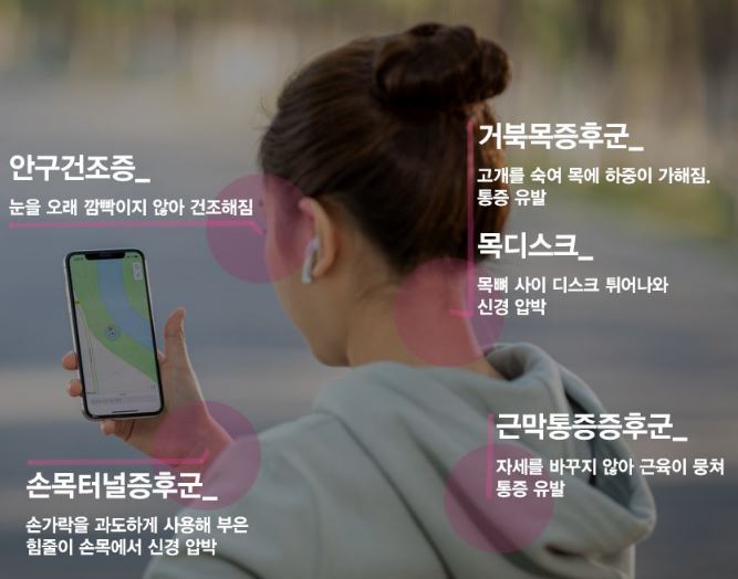 IT기기를 보느라 목을 숙이게 되면 특정부위에 하중이 집중되어 목디스크를 비롯한 퇴행성 질환이 발생할 수 있습니다. 목 디스크가 돌출되면 신경을 압박하거나 신경이 지나가는 공간을 좁게 만들어 목 통증을 비롯해 어깨, 팔의 통증이나 저림까지 유발할 수 있습니다.