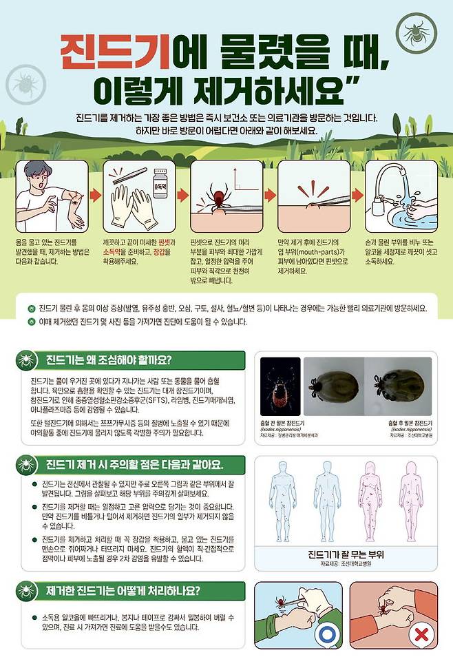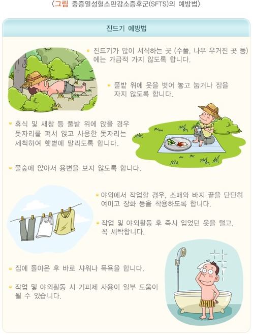 진드기 매개 감염병 예방은 치료제나 백신이 없어 진드기에 물리지 않은 것이 최선이 방법이다. 특히, SFTS의 경우 치명률(18.7%)이 높아 주의가 필요하다고 합니다..