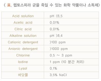 렙토스피라는 온도, 산성, 세균의 오염 등에 대단히 예민하여 위액, 담즙, 사람이나 소의 희석되지 않은 젖에 의해 쉽게 생명력을 잃는다. 45도 증류수에서 20~30분, 50도에서 10분, 60도에서 10초, 70도에서는 10초 이내에 사멸한다. 멸균된 맑은 물에서는 pH가 중성이면 4주 정도는 생존할 수 있지만 pH 5이면 2일밖에 생존하지 못한다. 오염된 상수에서는 18~20일간 생존할 수 있다. 병원성 렙토스피라는 바닷물에서 18~20시간 정도 생존할 수 있다.