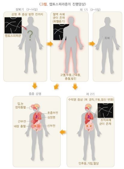 질병은 수 일에서 3주 정도, 또는 3주 이상 지속될 수도 있는데, 치료하지 않으면 회복까지 수개월이 걸릴 수도 있다. 임상 경과는 렙토스피라 혈증기(또는 발열기, 4~9일 지속됨)와 회복기(또는 면역기, 6일째부터 12일째까지 지속됨)로 나눌 수 있다. 중증 감염인 경우 간부전, 신부전증과 전신의 출혈 징후, 몸의 여러 곳에 나타나는 범발성 응고부전증과 심장염으로 진행될 수 있으며, 우리나라에서는 기침, 각혈 등 중증의 폐출혈형도 볼 수 있다.
