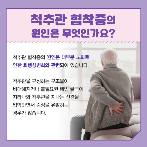 척추관이 좁아져 척추관 안으로 지나가는 신경 다발이 막히면서 증상을 일으키게 됩니다.