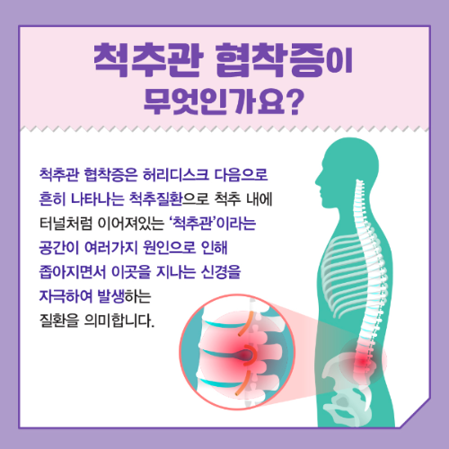 척추관협착증(Spinal Stenosis)은 척추관이 좁아져서 척수나 신경근이 압박받는 상태를 말합니다.