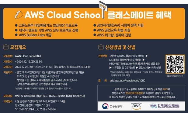 안녕하세요! 메이킹맨입니다. 한국전파진흥협회(RAPA)와 아마존웹서비시즈코리아는 오는 12월 시작될 ‘AWS Cloud School’ 8기 운영을 준비하고 있다고 밝혔습니다. 이번 포스트에서는 AWS와 AWS 클라우드 스쿨에 대해 자세히 알아보겠습니다.