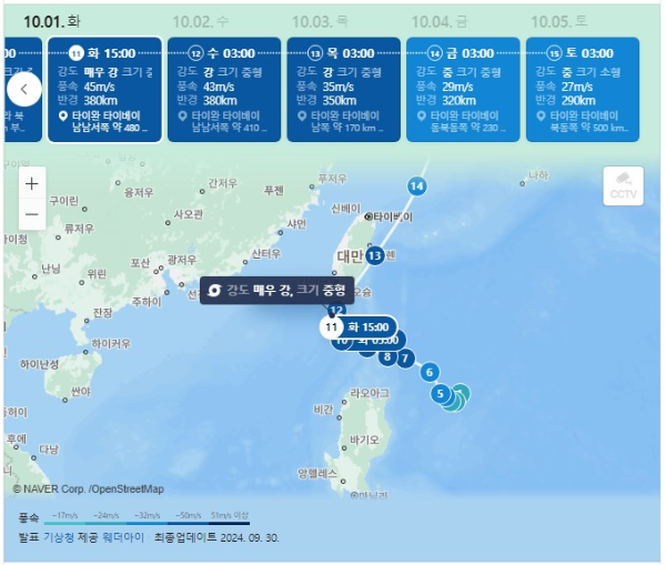 10월 1일쯤 방향을 틀어 한반도 쪽으로 향한다면 이번주 징검다리 연휴에 영향을 미칠 수 있습니다.