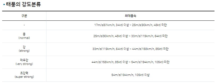 - 태풍 (Typhoon): 최대 풍속이 74노트(약 137km/h) 이상인 경우.