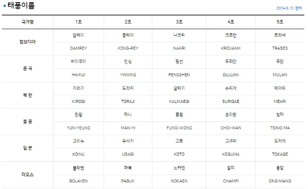 - 이름 목록: 아시아 태평양 지역의 여러 나라가 협력하여 태풍 이름 목록을 작성합니다. 이 목록은 각국의 기상청이 제안한 이름으로 구성됩니다.