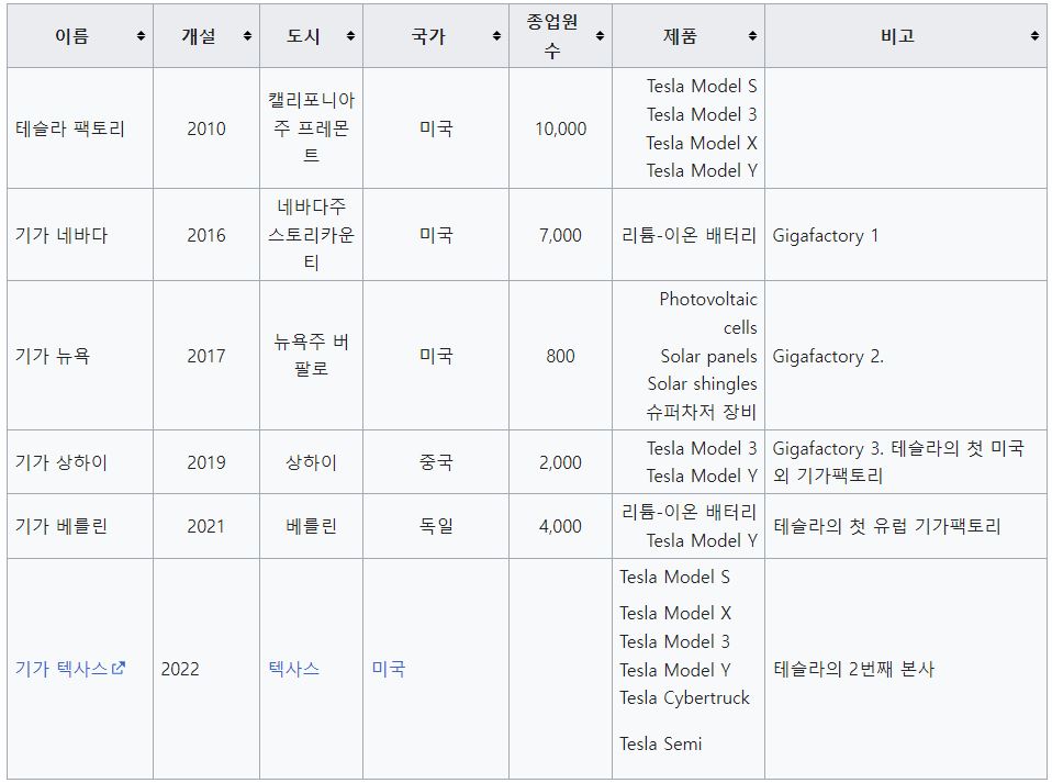 회사 본사 이외에, 테슬라는 차량 생산과 부품 생산을 위한 여러 공장을 운영하고 있다. 또한 세계 여러 곳에 자동차 전시장과 갤러리를 두고 있다.