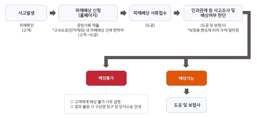 도로공사는 접수된 내용을 바탕으로 보험사를 통해 보상 절차를 진행하며, 사고 경위를 검토한 후 최종 보상을 결정합니다.