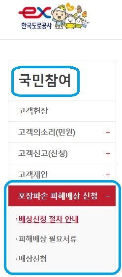 -고속도로: 한국도로공사 홈페이지에서 '노면파손 피해배상 신청' 메뉴 이용.