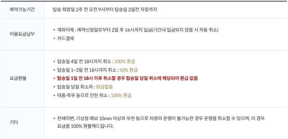 - 천재지변, 기상청 예보 10mm 이상의 우천 등으로 차량의 운행이 불가능한 경우
