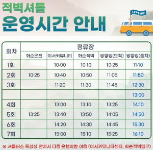 셔틀버스 특성상 만 차시 다음 운행차량 이용해 주세요. (이서커뮤니티센터, 화순적벽입구)