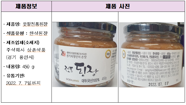 식품의약품안전처는 식품제조·가공업체인 ‘주식회사 상촌식품(경기 용인시)이 제조·판매한 웃말전통된장(식품유형: 한식된장)’에서 아플라톡신이 기준치보다 초과 검출되어 해당 제품을 판매중단하고 회수 조치한다고 밝혔다.