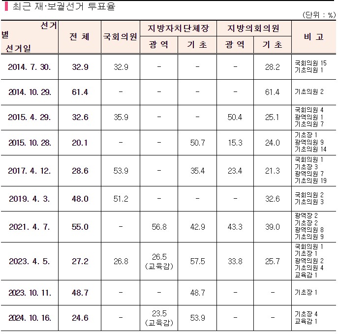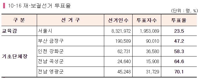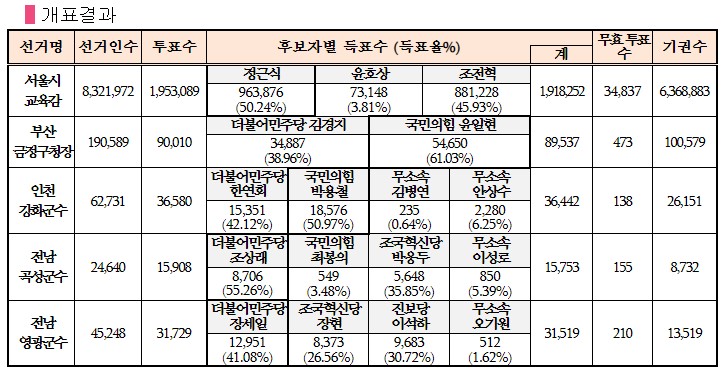 재·보궐선거의 평균 투표율은 24.6%로 전체 유권자 864만 5,180명 중 212만 7,316명이 투표에 참여했다. 이번 재·보궐선거는 교육감(서울) 1곳, 기초단체장(부산 금정구, 인천 강화군, 전남 곡성군·영광군) 4곳 등 총 5개 선거구에서 실시되었다.