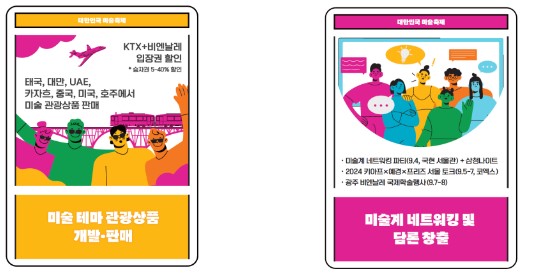 광주와 부산에서는 각각 비엔날레를 열어 미술 애호가를 끌어모으고, 올해로 3년째 공동 개최하고 있는 ‘키아프 서울’과 ‘프리즈 서울’은 외래관광객 증대는 물론 높은 수준의 관광객 평균 지출경비* 등 뛰어난 관광 콘텐츠로 자리 잡은 만큼 미술계의 큼직한 행사를 한데 모은 ‘2024 대한민국 미술축제’의 관광 효과가 크게 기대된다고 합니다.