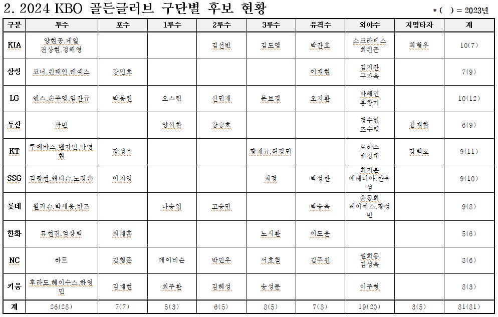 안녕하세요! 메이킹맨입니다. 야구 팬 여러분! KBO 리그의 가장 권위 있는 상 중 하나인 「2024 신한 SOL뱅크 KBO 골든글러브」 후보가 드디어 확정되었습니다. 27일(수) 발표된 이 명단에는 총 81명의 선수가 포함되었으며, 이 중에서 포지션별로 최고의 활약을 펼친 10명이 최종 수상의 영예를 누릴 수 있습니다. 과연 어떤 선수가 영광스런 자리에 오르게 될까요? 이번 포스팅에서는 후보로 올라온 선수들이 누구인지 살펴보겠습니다.