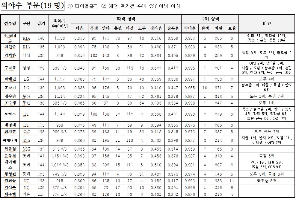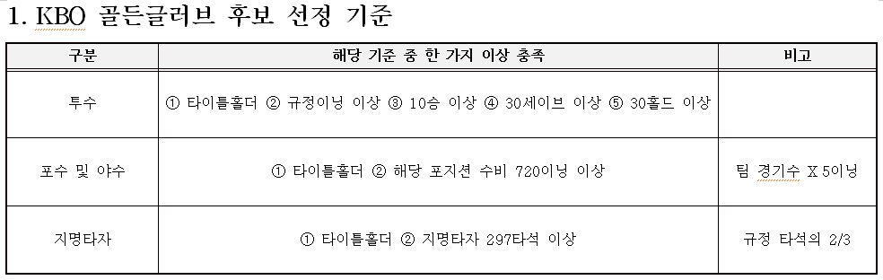 또한, KBO 정규시즌 개인 부문별 1위 선수는 자격 요건에 관계없이 후보로 자동 등록됩니다. 만약 여러 포지션에서 활약한 타이틀홀더가 수비 이닝 기준을 충족하지 못할 경우, 가장 많은 수비 이닝을 소화한 포지션의 후보로 선정됩니다.