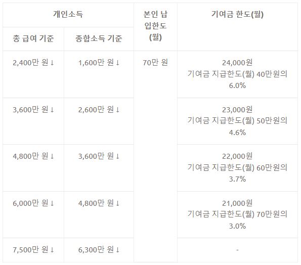 종합소득 기준에 따라 정부 기여금 매칭 비율이 달라집니다.