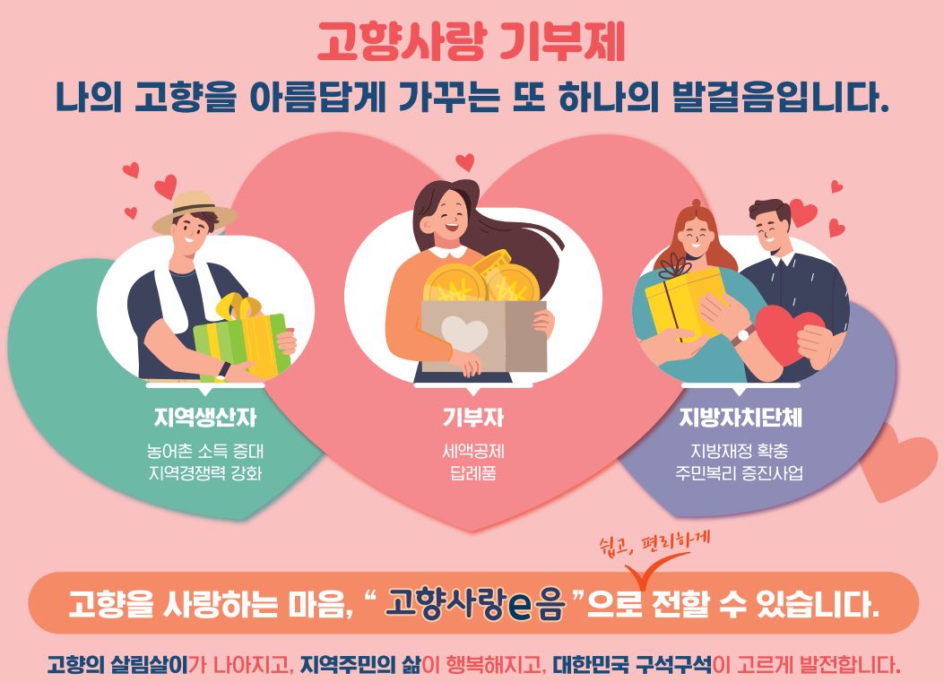 고향사랑 기부제는 개인이 고향을 생각하며 기부할 수 있는 기회를 제공하며, 기부금은 취약계층 지원 및 문화·예술 사업 등 지역 주민 복리 증진에 사용됩니다.