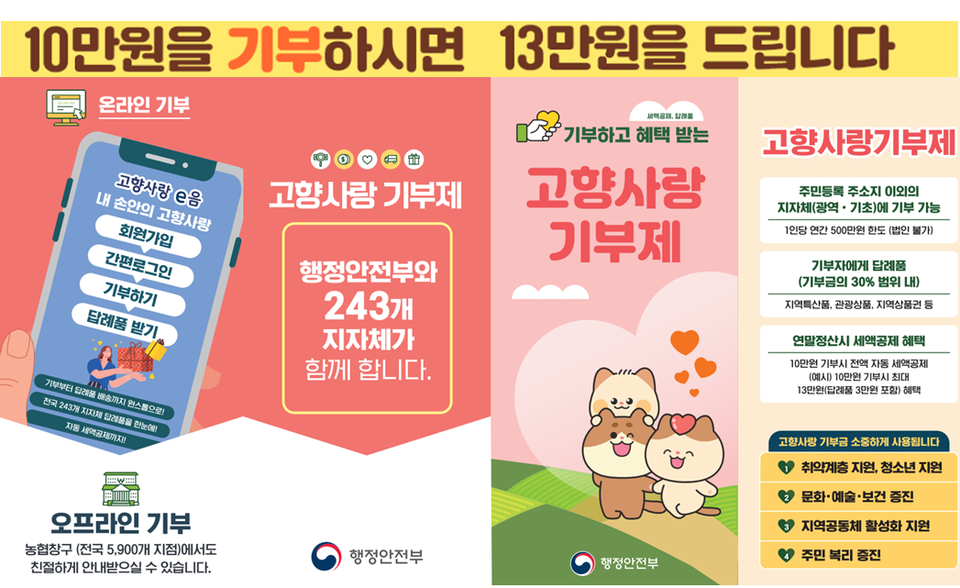2025년부터 시행되는 '고향사랑기부금' 제도는 지역 사회의 발전과 주민 복지를 증진하기 위한 새로운 기부 모델로 주목받고 있습니다. 이 제도에 따르면, 개인이 고향이나 특정 지역에 10만 원을 기부하면, 그에 대한 세액 공제와 함께 3만 원의 추가 혜택이 제공되어 총 13만 원의 가치를 돌려받게 됩니다.