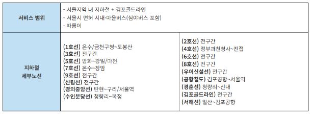 -이용범위: 서울지역 지하철 + 김포골드라인·진접선·별내선·고양시 구간·과천시 구간, 서울시 면허 시내·마을버스, 따릉이
