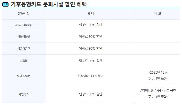 지원대상 : 기후동행카드 소지자에 대해 문화시설 입장 시 할인 혜택을 제공합니다.