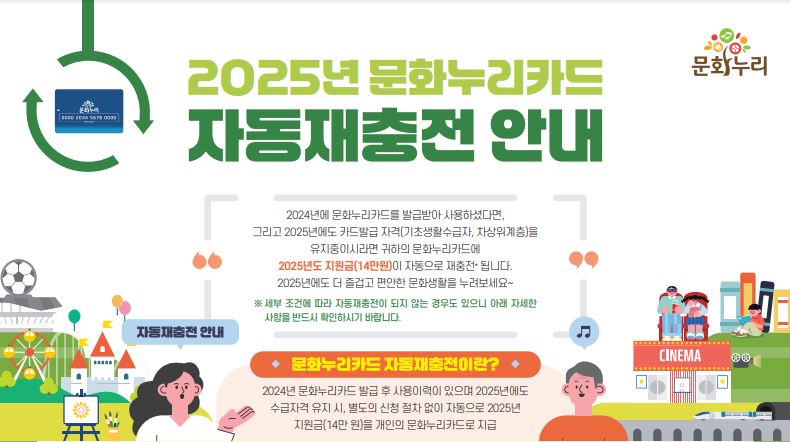 안녕하세요! 메이킹맨입니다. 2024년에 문화누리카드를 발급받아 사용하셨다면, 그리고 2025년에도 카드발급 자격(기초생활수급자, 차상위계층)을 유지중이시라면 각자의 문화누리카드에 2025년도 지원금(14만원)이 자동으로 재충전이 됩니다. 이번 포스팅에서는 문화누리카드 자동 재충전에 대해 꼼꼼l 살펴보겠습니다. 2025년에도 더 즐겁고 편안한 문화생활을 누려보세요.