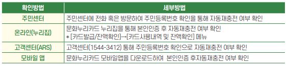 -온라인(누리집): 문화누리카드 누리집을 통해 본인인증 후 자동재충전 여부 확인