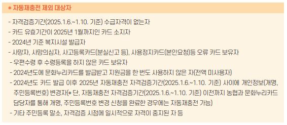 (* 단, 자동재충전 자격검증기간(2025.1.6.~1.10. 기준) 이전까지 농협과 문화누리카드 담당자를 통해 개명, 주민등록번호 변경 신청을 완료한 경우에는 자동재충전 가능)