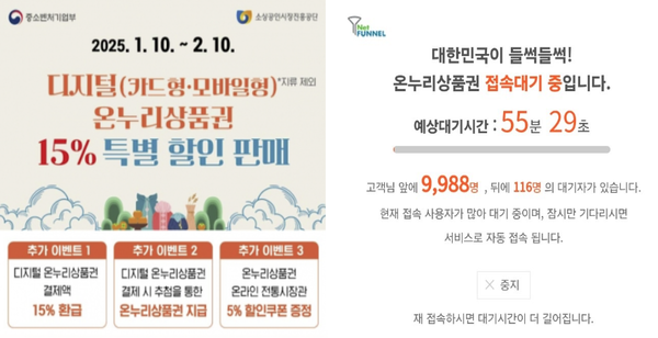 오는 10일부터 2월 10일까지 디지털 온누리상품권의 할인율이 기존 10%에서 15%로 높아지며, 온라인 전통시장 이용 시 상품 가격의 5% 할인 쿠폰도 지급됩니다. 또한, 디지털 결제액의 15%를 1인당 최대 8만 원까지 디지털 상품권으로 환급하고, 디지털 온누리상품권으로 3만 원 이상 결제 시 추첨을 통해 상품권도 지급합니다.