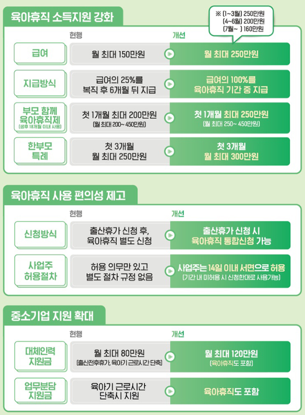 -한부모 근로자 지원: 한부모 근로자는 첫 3개월 동안 육아휴직 급여가 250만원에서 300만원으로 인상됩니다.