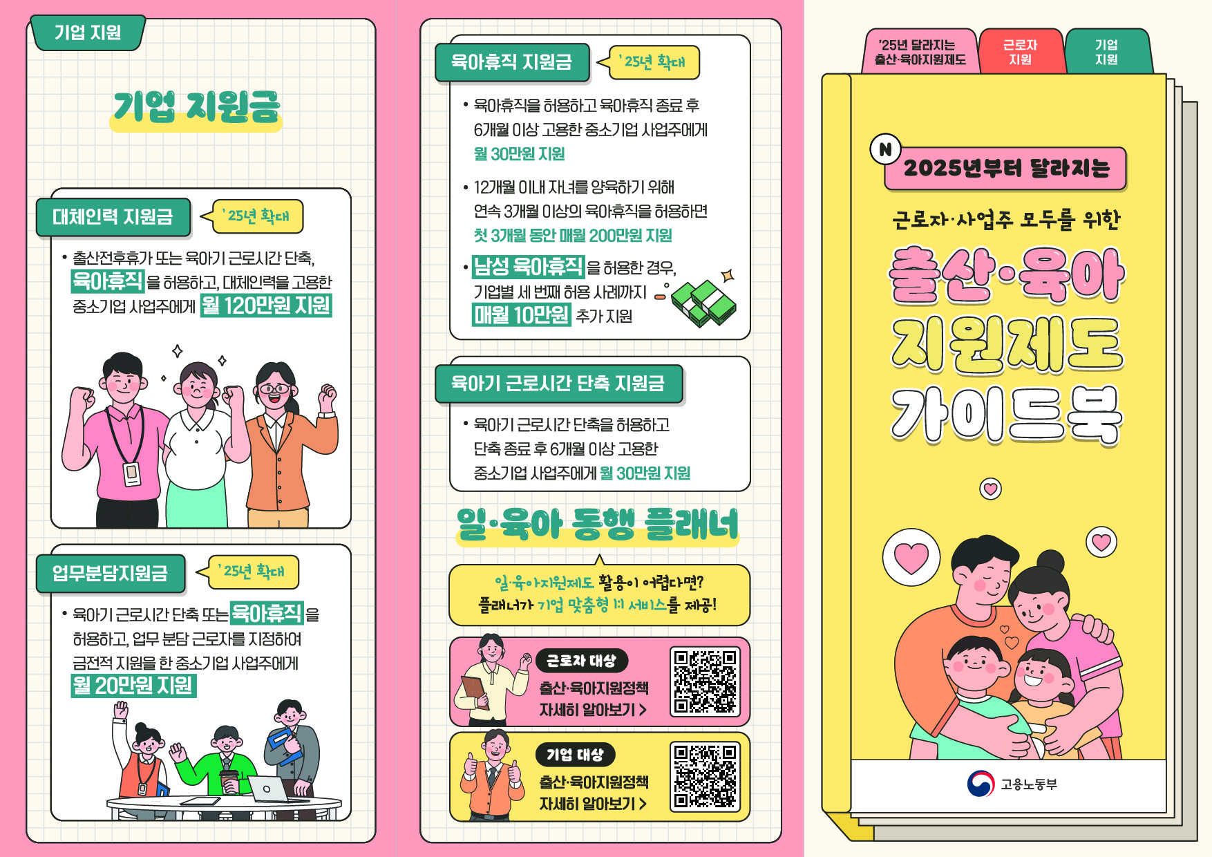 -중소기업 지원: 중소기업의 부담을 덜기 위해 대체인력 지원금이 월 120만원으로 인상되며, 육아휴직에 대한 업무분담 지원금도 신설됩니다.
