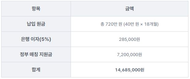 만기 수령 시에는 이자 28만 원, 매칭 지원금 720만 원을 합하여 총 1,468만 원을 수령할 수 있습니다.