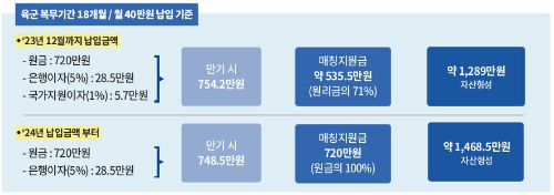장병내일준비적금은 18개월 동안 720만 원을 납입하고 은행 이자, 매칭 지원금 혜택, 비과세 혜택을 적용하면 약 748만 원의 이자 및 지원금을 받을 수 있습니다.
