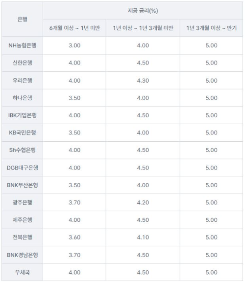 장병내일준비적금은 납입하는 원금에 비례하여 연 3.0~5.0%의 이자를 은행이 지급하고 있고, 특정 조건을 만족하면 추가 이자를 지급하는 우대금리도 있습니다. 은행의 약정이율과 우대조건은 변경될 수 있어, 정확한 금리는 해당 금융사에 직접 확인이 필요합니다. 2024. 07월 기준 은행의 제공 금리를 살펴보겠습니다.