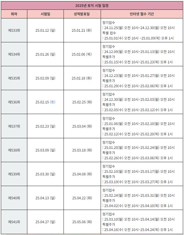 토익 시험은 매월 정기적으로 진행되며, 아래는 2025년 토익 시험 일정입니다.