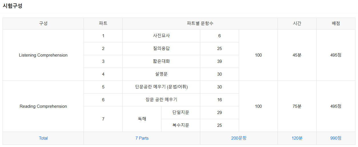 -구성: 듣기(100문항)와 읽기(100문항) 섹션으로 나뉨.