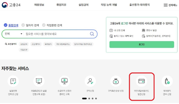 로그인 후 '국민내일배움카드 발급신청' 메뉴를 선택해 신청 절차를 진행합니다.