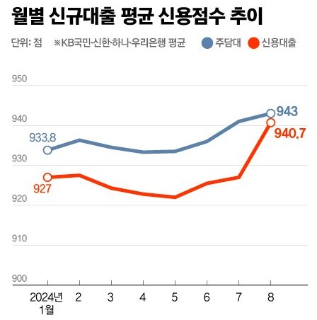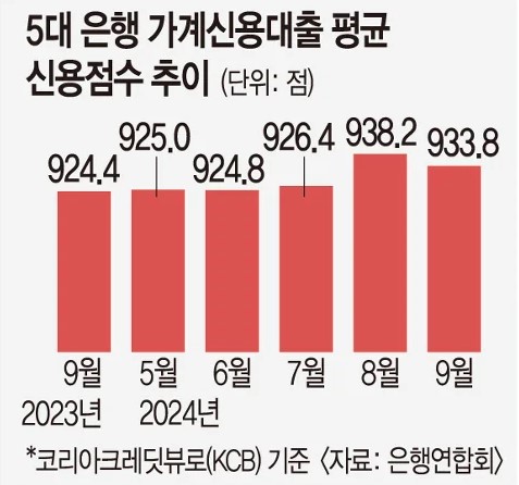 은행연합회에 따르면, 지난 9월 5대 은행(KB국민, 신한, 하나, 우리, NH농협은행)의 가계신용대출 평균 취급 신용점수는 933.8점으로, 지난해 9월의 924.4점에 비해 9.4점 상승했습니다. 특히, 시중은행들이 대출을 조인했던 8월에는 평균 취급 신용점수가 938.2점까지 치솟았습니다. 신용등급은 KCB(코리아크레딧뷰로) 기준으로 1등급이 942점 이상, 2등급이 891941점, 3등급이 832890점으로 구분되며, 통상 3등급까지 고신용자로 분류되지만, 현실적으로 2등급도 1금융권 신용대출을 받기 어려운 상황입니다.