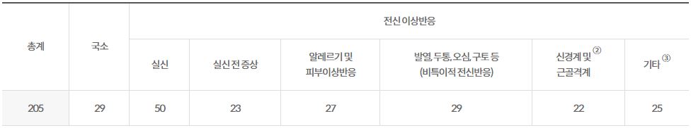 2024년 4월 기준 사람유두종바이러스 백신 국가예방접종 도입 후 약 289만 건 접종 후 205건(0.007%)의 이상반응이 신고되었고, 이 중 심인성 반응인 일시적인 실신 및 실신 전 어지러움 등의 증상(73건, 35.6%)이 가장 많았습니다.