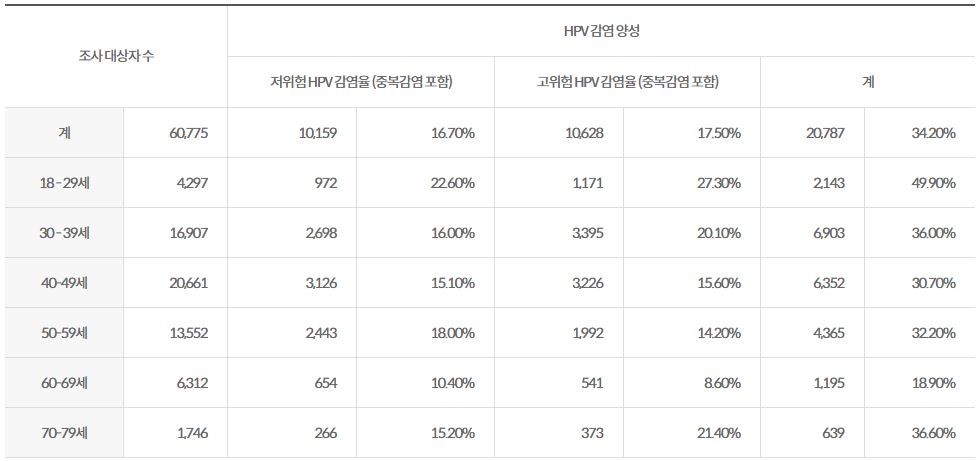 2006년부터 2011년까지 우리나라의 18~79세 여성 60,775명을 대상으로 한 연구 결과 조사 당시 대상의 34.2%(20,787명)가 HPV에 감염되어 있었습니다.
